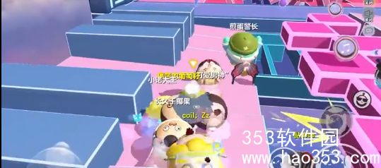 2、等滚动技能刷新好了之后就可以开启技能开滚动通过粉色板块,然后回到达滚筒,在这里小蛋仔们直接走下面,下面会容易走一些,阻碍没有那么多;